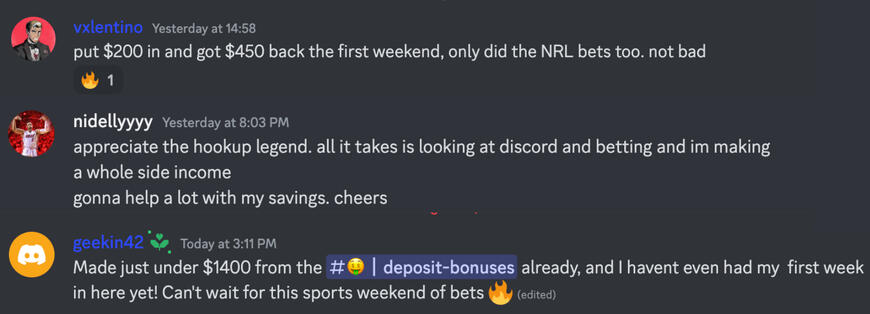 Follow our statistically formulated bet slips on Soccer, Racing, NRL, AFL, NBA and more...Upon joining, we show you how to collect $2-$3k straight away using our deposit bonus method!
